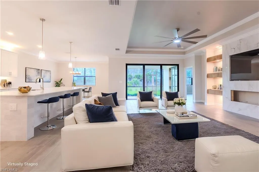 A custom double glass front entry opens to a welcoming foyer highlighted by tongue-and-groove wood ceilings that continue through the front entry and extended lanai. Crown molding flows throughout the home, enhancing the open-concept design. The spacious living area features a custom-built entertainment center with fireplace, mounted TV, and accent lighting, creating a refined yet comfortable gathering space.