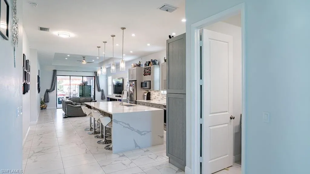As you make your way up the charming paved driveway, you’re welcomed by the timeless elegance of double glass French doors—an entry that sets the tone for what’s inside. This beautifully maintained 3-bedroom, 3-bathroom home—with a flexible den space—sits on 1.14 acres of land, offering space and room to grow. Step inside, and you’re greeted by an open-concept layout that feels both effortless and intentional. The heart of the home is the chef’s kitchen, designed for gathering and connection. With stainless steel appliances, gleaming quartz countertops, and a thoughtfully chosen backsplash, it’s equal parts style and function. The oversized island invites friends and family to pull up a stool, pour a glass of wine, and linger awhile—because the best moments are the ones shared over good food and conversation. The kitchen flows seamlessly into the great room, where a floating cabinet and a modern glass fireplace add warmth and character. But it’s the outdoor space that truly tells the story of this home. Step out onto the 1000 sqf. lanai and discover a retreat designed for celebrating the everyday—a sparkling pool with spillover spa, a fully equipped outdoor kitchen, and cozy areas to sip your morning coffee or gather under the stars. And because life is meant to be lived both indoors and out, you’ll find thoughtful details like a dedicated pool bath with a separate shower—perfect after a day in the sun. Inside, tile floors throughout make maintenance a breeze, while the laundry room—with its front-loading washer and dryer, built-in sink, and ample cabinetry—makes daily routines feel a little more special. With a spacious two-car garage and room for all the things that make a house a home, this property isn’t just a place to live—it’s a space to slow down, connect, and create memories that will last a lifetime.